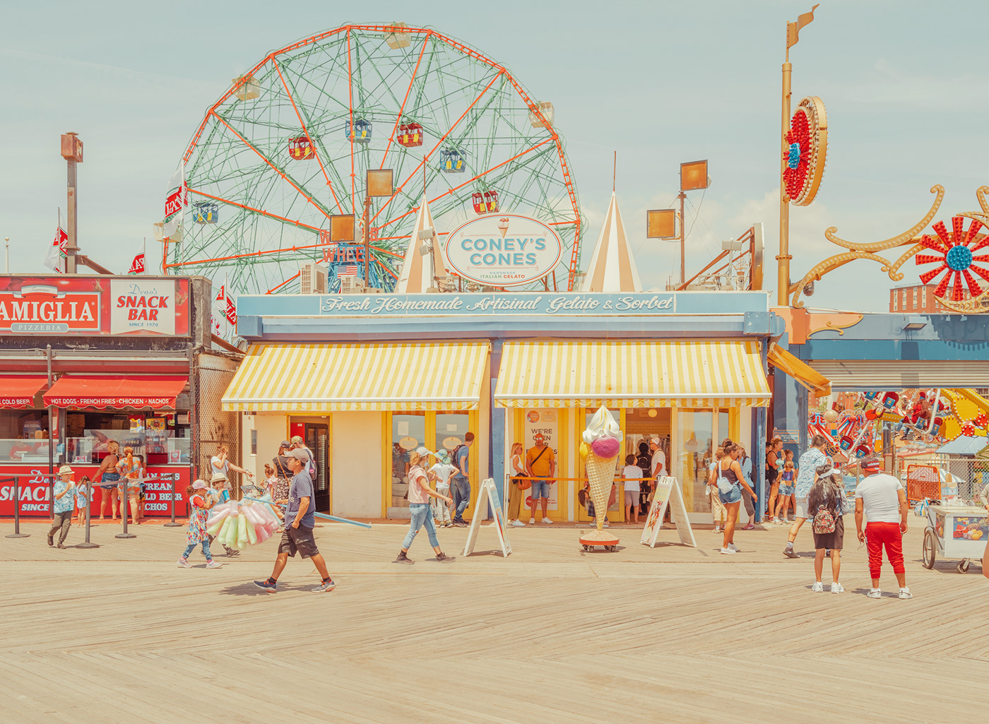 Hoy nos perdernos por los más de 3 kilómetros de boardwalk y por las atracciones, incluso nos sentaremos a degustar uno de esos únicos (a saber por qué, pero lo son) perritos calientes de Nathan’s de la mano de un genio, Ludwig Favre (previously en Phusions). Y es que todo en esta serie te lleva allí. Todo. La paleta, ese calor que sin duda te acompaña en verano, la mirada panorámica que contrasta con algunos detalles precisos, como si estuvieras a punto de montarte en la Wonder Wheel… Todo.