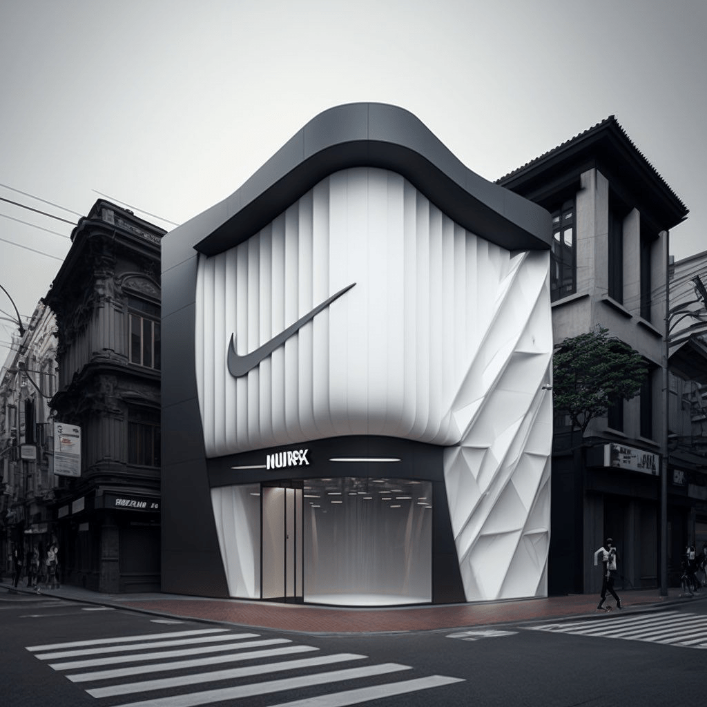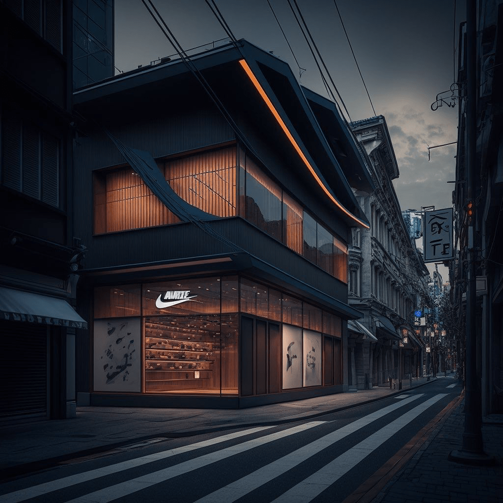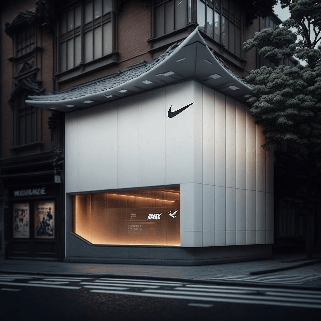 Hoy, traigo un par de ejemplos vinculados con Nike. En este caso, Benichou, usando Midjourney se planteó dos retos curiosos. El primero, cómo sería una tienda conceptual de la compañía de Oregón, en Kioto. El uso de esta herramienta le permitió experimentar el potencial de la IA para mejorar no solo el diseño del mundo real, sino también las realidades virtuales como los videojuegos. Los diseños obtenidos resultan increíblemente fascinantes, una explosión de creatividad arquitectónica que no te dejará indiferente y que es capaz de conjugar, perfectamente, la esencia de Nike con el carácter japonés.