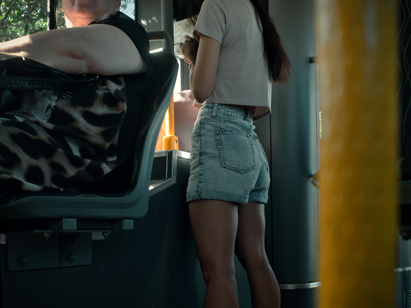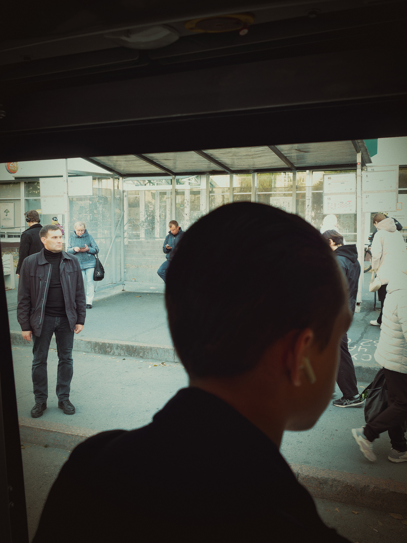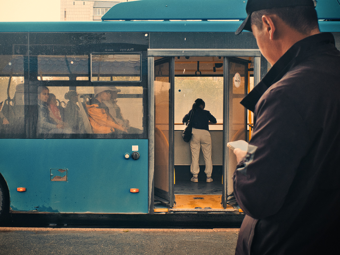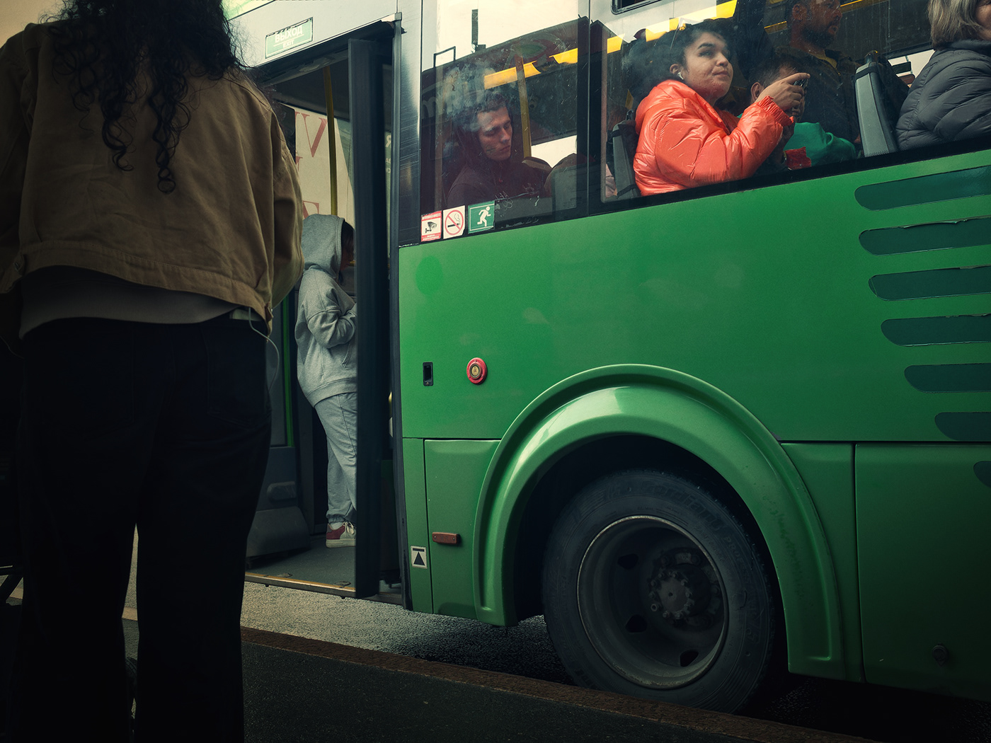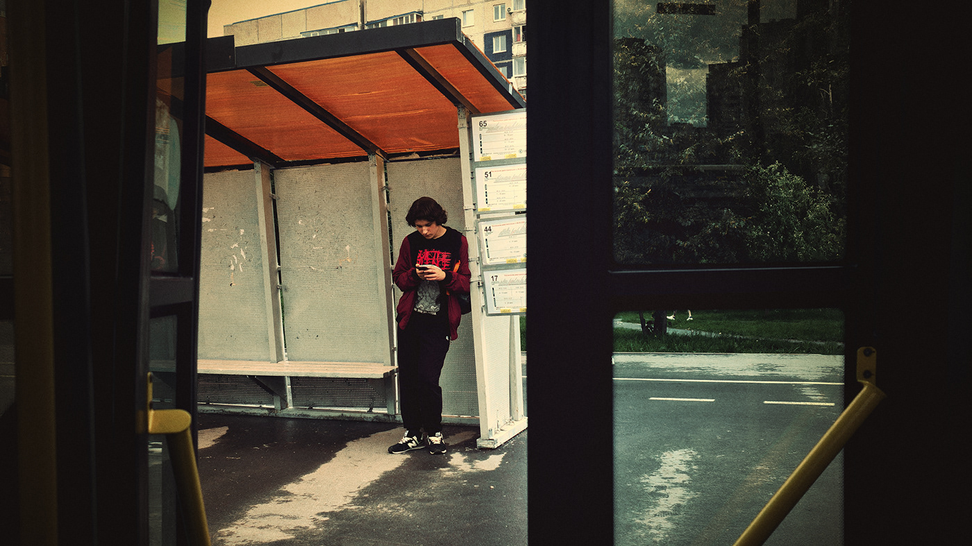 Técnicamente, Grebnev trabaja con una precisión que refleja su maestría. Aprovecha el juego de luces y sombras, los reflejos en el cristal del autobús, y los encuadres que sugieren más de lo que muestran. Sus colores son una mezcla perfecta de tonalidades apagadas y vibrantes, como si cada foto respirara la atmósfera exacta del momento en que fue tomada.