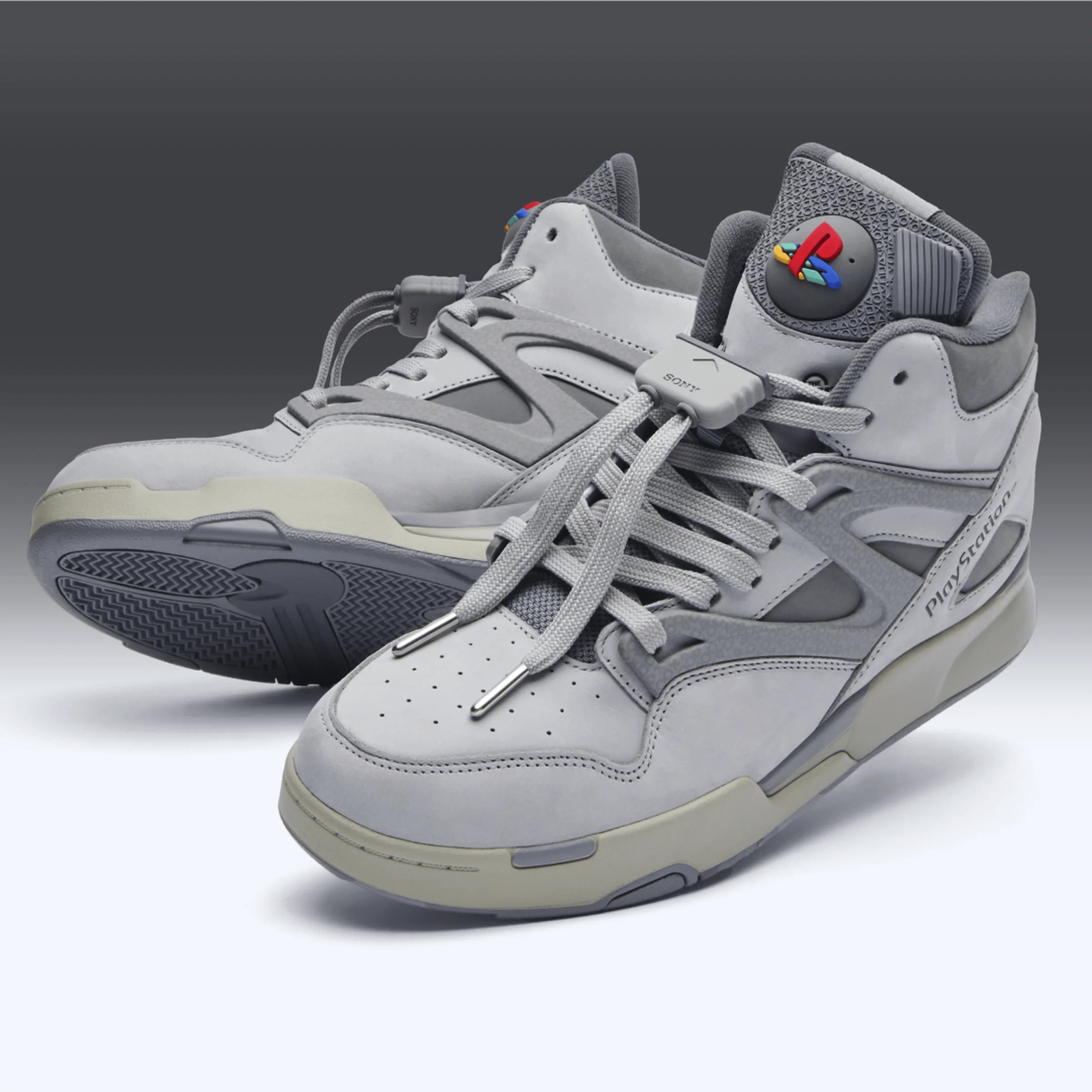 Las zapatillas cuentan otra historia, igual de cuidada pero más visceral. Reebok ha elegido tres siluetas icónicas de los noventa, las InstaPump Fury 94, Pump Omni Zone II y Workout Plus, y las ha teñido del gris característico de la PS1. Cada par incluye detalles que parecen, incluso, obsesivos, pero que forman parte de la liturgia: fechas de lanzamiento originales impresas en las lengüetas, botones de la consola reproducidos en los cordones, incluso un pump ball (ojo) con la función «Press Play» en el modelo japonés.
