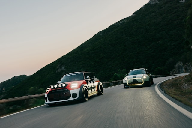 Dos coches MINI personalizados, uno con diseño de rally y otro eléctrico, rodando por una carretera de montaña rodeada de vegetación.