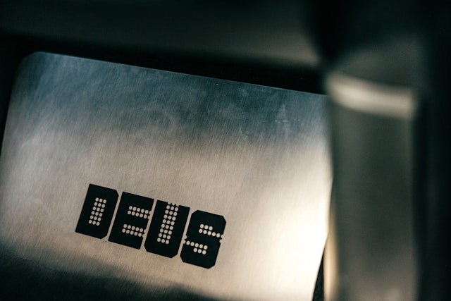 Vista cercana de una superficie metálica con el logo de 'Deus' en relieve, resaltando el diseño elegante y moderno del vehículo.